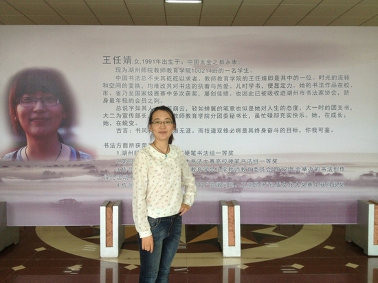 王任婧自八歲開始學習書法,目前已經堅持了15年。現在練字已經成了王任婧生活的一部分,一有時間就會進行書法的臨摹。字如其人,重若崩云、輕如蟬翼的筆意,似乎是她對人生的態度,她說從寫字中能夠學會怎樣做人,學會心平氣和地對待事物,“坐著不停地寫一天的字,也不會覺得累。寫字鍛煉了我,讓我做什么事情都能很有耐心。”王任婧說。經過多年的努力,王任婧在書法上取得了不菲的成就,作品《非?!吩谌珖處熃逃龑W會小學教師教育委員會2012年會舉辦的書法創作評比活動中榮獲一等獎,在第四屆浙江省大中小學生書法大賽中獲高校硬筆書法組一等獎,作品《書譜序》在永康市“黨徽閃亮 工商昂揚”紅盾文化大獎賽中榮獲銀獎等,目前已躋身湖州市書法協會會員,成為最年輕的會員之一。