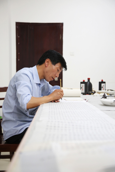 對于黨章,王海華一直心存敬重,堅持以身作則,發揮先鋒模范作用,提高黨性覺悟,抓好黨建工作。恰逢“兩學一做”學習教育這一契機,作為書法家的他做了一個大膽的決定——在絹上抄寫黨章,這也是他的首創,因為在絹上抄寫黨章不僅要有書法基礎,還需要一氣呵成,不能出現失誤,否則就要重頭再來。