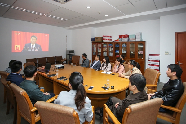 在明達樓,學校黨政領導及機關行政人員心懷喜悅,認真聽取了習近平總書記作的報告,一同回顧了過去五年,黨在全面建成小康社會、全面深化改革、全面依法治國、全面從嚴治黨等方面取得的歷史性成就,同時,也進一步明確了未來五年的歷史責任與奮斗目標。大家一致表示,報告全面客觀、思路清晰、目標明確、振奮人心。