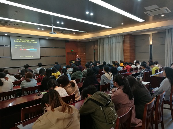 應我校校長張立欽的邀請,4月1日,英國皇家學會會士、牛津大學Nicholas Harberd教授在浙江大學鄭紹建教授的陪同下來我校交流訪問,分別作《綠色環保革命:生長-代謝協同調控》、《植物應對營養逆境之策略》學術報告。報告會由張立欽主持,省媒介生物學與病原控制重點實驗室、生科院藥學系骨干教師及2017級學生代表聆聽了報告。