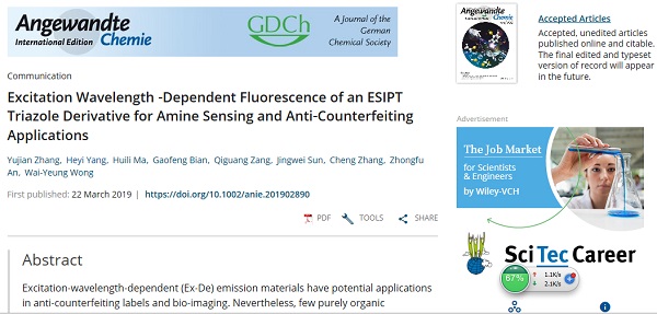 近日,我校工學院張玉建副教授在國際頂級學術期刊《Angewandte Chemie》上發表了一項題為“Excitation Wavelength-Dependent Fluorescence of an ESIPT Triazole Derivative for Amine Sensing and Anti-Counterfeiting Applications”的最新研究成果。