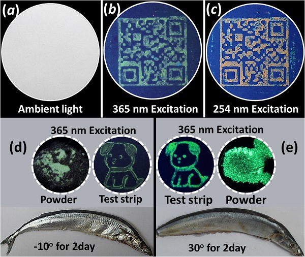 針對以上難題,湖州師范學院張玉建博士課題組巧妙地將激基締合物(Excimer)引入到激發態質子轉移(ESIPT)分子中,形成多種非平衡的激發態(LE態,Excimer,ESIPT的酮式)。然后,通過改變激發能量調控激發態的內轉換通道,最終實現激發波長依賴的熒光性質。結果表明,分子的晶體粉末在高能量激發(小于350nm)時,形成ESIPT的酮式結構,觀察到的是橙色熒光。而在低能量波長(大于365nm)的光照射下,激基締合物發光起著主導作用,熒光顏色變為淺綠色。將該熒光分子制成二維碼,在自然光下其不可見,然而在365nm的紫外燈照射下,可觀察到淡綠色的二維碼。有趣的是在254 nm紫外光激發下得到一個可掃描的橙色二維碼,達到防偽的目的。同時,該熒光分子能高靈敏地識別環境中的胺衍生物,對氨氣(NH3)檢測限可以低至14.1 ppm。比如將秋刀魚30 ℃環境放置兩天,檢測試紙上的熒光材料將從淡綠色變為亮綠色,以上結果說明該試紙可高靈敏地識別動物蛋白的腐爛。以上結果表明,通過控制多種非平衡激發態的弛豫通道實現激發波長依賴熒光的設計思路是可行的,同時也為制備有機防偽材料開辟了新的道路。