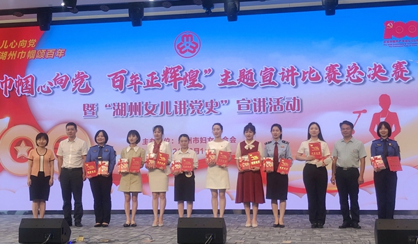 為慶祝中國(guó)共產(chǎn)黨成立100周年,深入開展黨史學(xué)習(xí)教育,進(jìn)一步團(tuán)結(jié)引領(lǐng)廣大婦女群眾聽黨話、跟黨走,在全社會(huì)營(yíng)造學(xué)“四史”、頌黨恩的濃厚氛圍,6月11日下午,湖州市婦聯(lián)舉辦“巾幗心向黨 百年正輝煌”主題宣講比賽總決賽暨“湖州女兒講黨史”宣講活動(dòng)。我校馬克思主義學(xué)院何燕老師和教師教育學(xué)院學(xué)生錢高藝入圍決賽,并最終獲得了一等獎(jiǎng)和三等獎(jiǎng)的好成績(jī)。