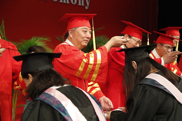 在下午的學士學位授予儀式上,校領導班子成員、教師代表為獲得學士學位的學生正冠撥穗、頒發學位證書并合影留念。