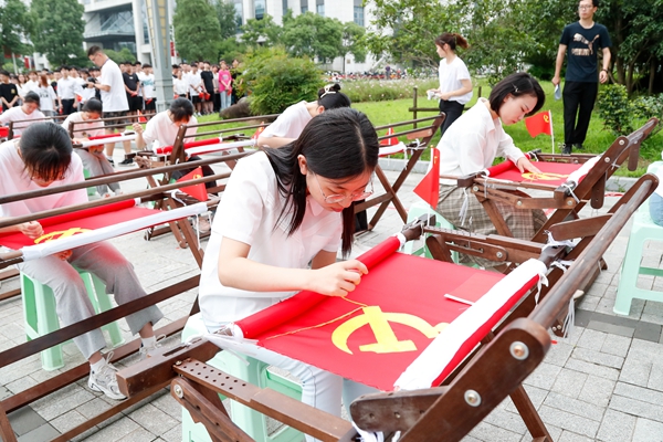 儀式上,100位師生在經歷了近100天的繡制后,在今天為100面黨旗進行了收針。
