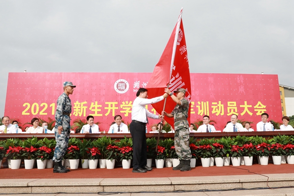 軍訓(xùn)動員會上,金佩華向軍訓(xùn)團(tuán)授旗。