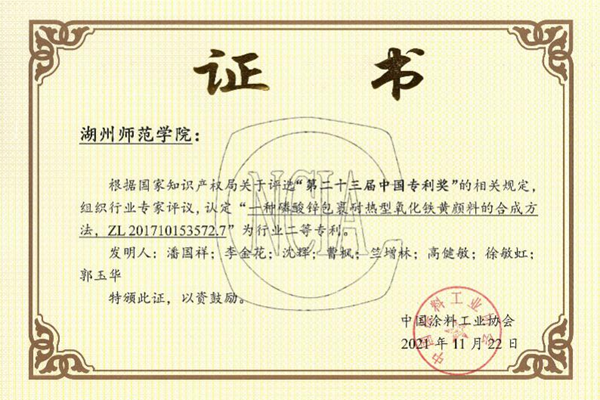 近日,從中國涂料工業協會獲悉,我校擁有的“一種磷酸鋅包裹耐熱型氧化鐵黃顏料的合成方法”發明專利榮獲 2021年中國涂料行業專利獎二等獎,這是我校發明專利首次獲得行業專利獎。據悉,2021年中國涂料行業專利獎一共評選出一等獎3項、二等獎4項、三等獎7項;其中獲得一等獎的3項專利獲推中國專利獎。