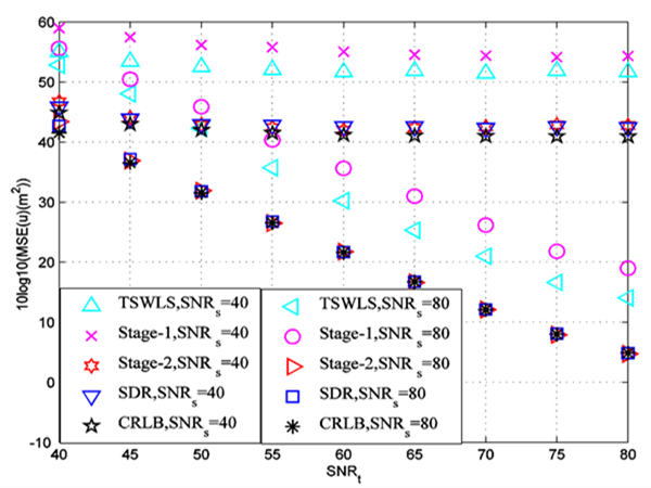 該成果提出了一種未知發(fā)射源信息的多輸入多輸出(Multiple-Input Multiple-Output,MIMO)雷達(dá)系統(tǒng)目標(biāo)定位方法,該方法通過部署接收機(jī)和廣泛存在的基站,無需基站的地理位置與時(shí)鐘偏差信息,即可實(shí)現(xiàn)目標(biāo)位置的精確定位,具有良好的應(yīng)用前景。由于雷達(dá)系統(tǒng)目標(biāo)定位問題的非線性特性,傳統(tǒng)數(shù)值計(jì)算方法難以保證估計(jì)結(jié)果的全局收斂。因此該成果中也設(shè)計(jì)了兩種有效的目標(biāo)位置估計(jì)算法:代數(shù)解析法與凸優(yōu)化松弛法,以保證結(jié)果收斂以及精度性能。同時(shí)分析比較兩種算法的計(jì)算復(fù)雜度與精度性能,研究結(jié)果發(fā)現(xiàn),在目標(biāo)位置估計(jì)方面,兩種不同算法的定位精度在高信噪比時(shí)都能接近最優(yōu)性能。