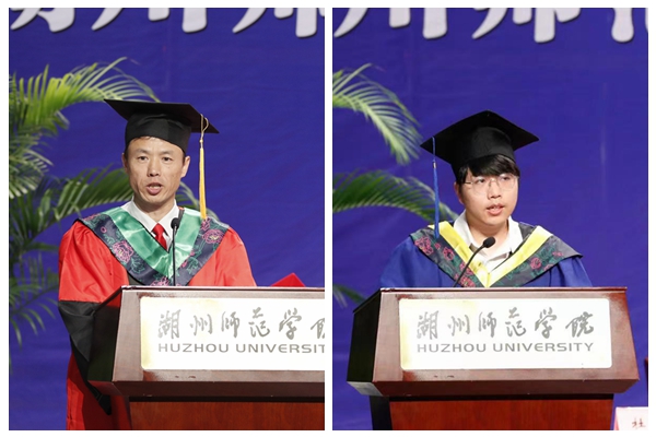 畢業研究生代表信息工程學院彭蔚同學,向培養自己的母校、敦敦教誨的導師致以誠摯的感謝;追憶、感恩過往三年的同時,也表達了對即將踏上的新征程的向往。生命科學學院徐奇友教授作為導師代表送給畢業生們五顆心:一是上進心,做一個有理想、有抱負的追夢人;二是責任心,做一個愛工作、有擔當的人;三是愛心,做一個愛生活、樂于助人的人;四是良心,做一個堂堂正正、光明落落的人;五是陽光心,做一個開開心心的人。