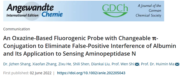 近日,我校生命科學學院湖州市醫藥與環境應用技術重點實驗室尚積禎副教授在消除光學探針白蛋白假陽性干擾研究方面取得創新進展,以第一作者身份在國際頂級學術期刊《Angewandte Chemie International Edition》(一區TOP, IF = 16.823)上發表題為“An Oxazine-Based Fluorogenic Probe with Changeable pi-Conjugation to Eliminate False-Positive Interference of Albumin and Its Application to Sensing Aminopeptidase N”的研究成果。