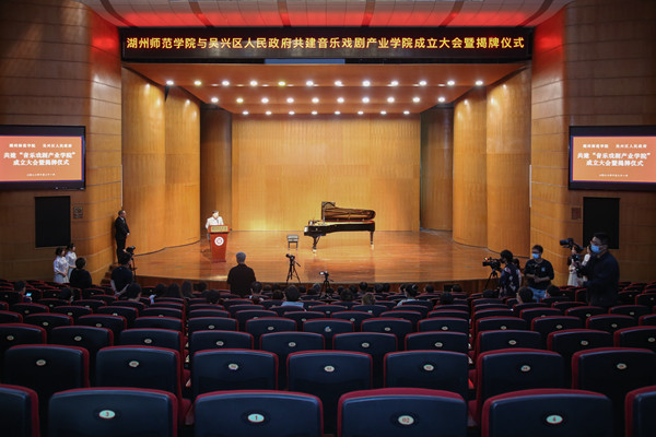 10月21日上午,我校與吳興區(qū)人民政府共建“音樂戲劇產(chǎn)業(yè)學(xué)院”正式揭牌成立。中共吳興區(qū)委副書記、區(qū)長潘永鋒,區(qū)委常委、宣傳部長朱小芳,副區(qū)長金斌斌,校黨委書記金佩華,黨委副書記陳永華,副校長李慶峰,黨委委員、黨校辦主任勞士健出席,吳興區(qū)區(qū)府辦、區(qū)委宣傳部、區(qū)文旅體局、區(qū)城投集團,我校黨校辦、教務(wù)處、社會合作處、音樂學(xué)院等相關(guān)部門和學(xué)院負(fù)責(zé)人,以及30余名師生代表參加了揭牌儀式。