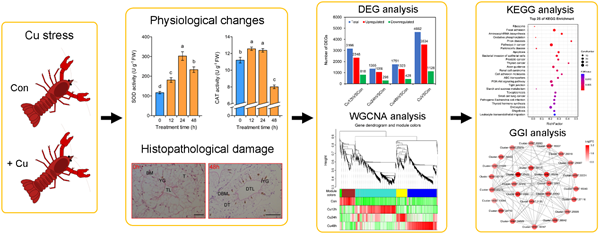 銅(Cu)是一種生物累積性重金屬,是水生生態(tài)系統(tǒng)中廣泛存在的環(huán)境污染物。克氏原螯蝦是一種重要的淡水水產(chǎn)養(yǎng)殖物種,它們能夠適應多種環(huán)境脅迫,包括重金屬脅迫,其肝胰腺被認為是重要的重金屬解毒器官。但是,目前克氏原螯蝦肝胰腺應答銅脅迫的分子機制還不清楚。本研究利用比較轉錄組學、加權基因共表達網(wǎng)絡分析(WGCNA)和熒光定量PCR技術(qPCR)分析了克氏原螯蝦肝胰腺響應銅脅迫的分子機制。該項研究成果可為克氏原螯蝦響應銅脅迫提供新的見解,并為其抗逆育種提供必要的理論基礎。