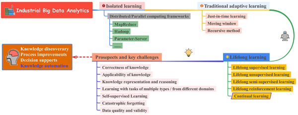 智能制造和工業互聯網時代的到來帶來了越來越多的機遇以及對現代工業的挑戰。具體來說,得益于數字、網絡、智能和工業自動化等領域的技術,傳統制造業的生產模式正在發生變革。工業大數據分析作為連接智能制造與工業互聯網平臺的核心環節,越來越受到學術界和產業界的重視。高效挖掘工業大數據所蘊涵的高價值信息,以及利用真實的工業過程是目前最熱門的話題之一。同時,隨著工業自動化向知識自動化的深入發展,工業大數據分析的學習范式也在相應地發展。因此,本文從工業大數據分析的視角出發,針對相應的工業場景,積極探索工業大數據背景下學習范式的變革: a) 分析工業大數據分析范式的演變,即從孤立學習到終身學習,并進一步總結兩者之間的關系; b) 列出了終身學習的主流方向,并詳細討論了其在工業場景中的應用; c) 展望未來發展方向。