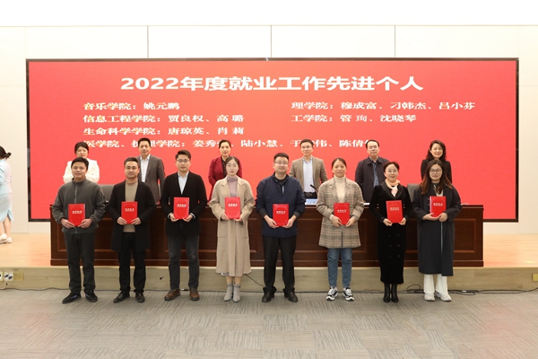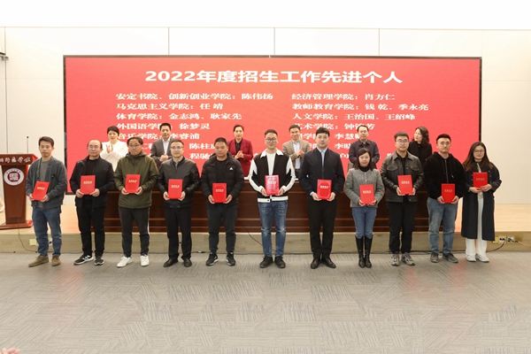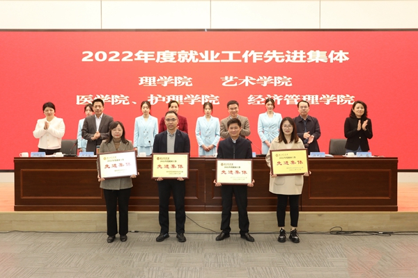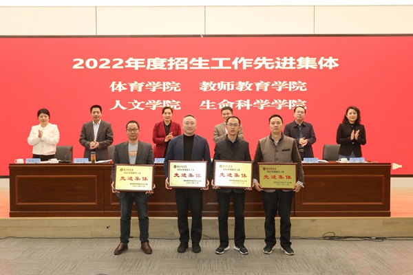 丁敢真宣讀表彰文件。體育學院、教師教育學院、人文學院、生命科學學院等4個學院被評為2022年度招生工作先進集體;理學院、藝術學院、醫學院、護理學院、經濟管理學院等4個學院被評為2022年度就業工作先進集體;陳偉揚等18人被評為2022年度招生工作先進個人;譚珊等33人被評為2022年度就業工作先進個人。與會領導為獲獎的先進集體和個人頒獎。