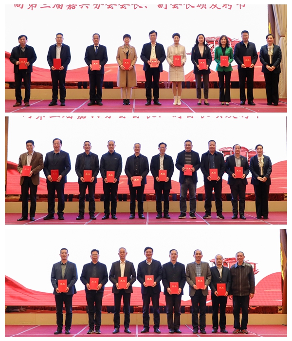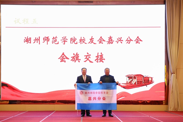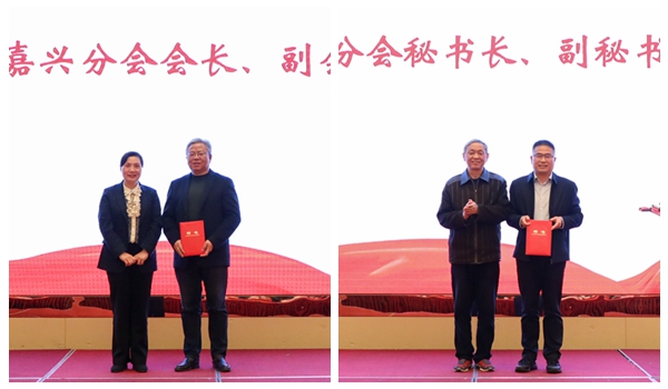 金佩華、許慧霞、朱鴻為嘉興分會新一屆組織機構成員頒發聘書。孫建良與沈丁華進行了會旗交接儀式。