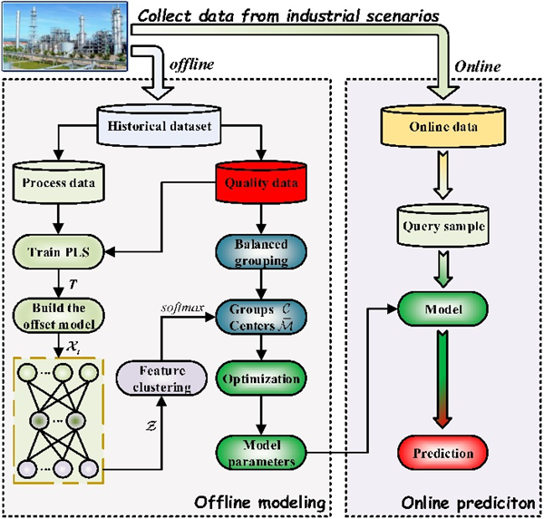 對(duì)于大多數(shù)具有強(qiáng)非線性和多模態(tài)特征的現(xiàn)代工業(yè)過程,傳統(tǒng)的線性軟測量方法可能無法很好地工作。同時(shí),面對(duì)復(fù)雜的數(shù)據(jù)分布,傳統(tǒng)的全局建模方法對(duì)數(shù)據(jù)表示能力提出了很高的要求,這對(duì)軟測量建模提出了挑戰(zhàn)。此外,數(shù)據(jù)分布的不平衡性在一定程度上加劇了模型對(duì)局部信息的忽略,從而提高了模型的整體預(yù)測難度。為此,針對(duì)實(shí)際工業(yè)大數(shù)據(jù)存在的強(qiáng)非線性和多模態(tài)特性,從概率融合局部建模的角度,首次提出了一種基于質(zhì)量相關(guān)特征聚類(QRFC)的工業(yè)軟測量模型。在QRFC中,偏最小二乘(PLS)可以對(duì)建模的初始特征空間給出合理的、解釋性的指導(dǎo)。此外,通過均衡數(shù)據(jù)分組,使用統(tǒng)一的視角對(duì)不同的數(shù)據(jù)分布進(jìn)行建模。進(jìn)一步,引入調(diào)節(jié)變量學(xué)習(xí)特征空間,通過迭代方法完成輸出相關(guān)聚類,隱式構(gòu)建與質(zhì)量變量的相關(guān)性,從而形成整體預(yù)測能力的局部逼近。一般來說,這種框架的好處,包括更好的相關(guān)性一致性和更強(qiáng)的處理過程非線性和多模態(tài)的能力,導(dǎo)致了卓越的性能。為了評(píng)估所開發(fā)的軟測量模型的可行性和效率,以實(shí)際工業(yè)案例為例進(jìn)行了驗(yàn)證。
