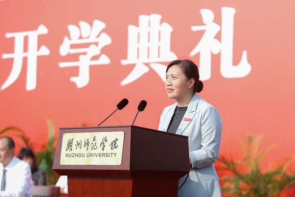 典禮上,許慧霞以《大道如砥 行者無疆》為題寄語新生,代表學(xué)校對2023級新同學(xué)表示熱烈歡迎。她說:“天下湯湯,道路萬千。來自五湖四海的新同學(xué)們沿著不同的道路匯聚湖師,道路將我們與你們相連,將夢想與現(xiàn)實(shí)相連,也將過去、現(xiàn)在與未來相連。”她以“道路”二字切入主題,并引申出“道”,指出“道”是軌跡、是行動(dòng)、亦是真理。同學(xué)們正是用自己的腳步追隨著中華民族的復(fù)興之路、強(qiáng)國之路。作為師長,許慧霞與新同學(xué)們分享了三點(diǎn)建議:一是矢志不移,堅(jiān)守天下為公的人生之道。一代代湖師人奮斗在國家經(jīng)濟(jì)社會(huì)建設(shè)的各條賽道上,創(chuàng)造了巨大的社會(huì)價(jià)值。同學(xué)們要以前行者為榜樣,厚植家國情懷、勇?lián)鷷r(shí)代使命,用腳步丈量祖國大地,用眼睛發(fā)現(xiàn)中國精神,用耳朵傾聽人民呼聲,用內(nèi)心感應(yīng)時(shí)代脈搏,用青春之履在祖國大地上留下最堅(jiān)定、最踏實(shí)的足跡。二是勤學(xué)不怠,走好成長成才的大學(xué)之道。“大學(xué)之道,在明明德,在親民,在止于至善。”大學(xué)的正道,就是通過正己修身、格物致知來革新自我與民眾,并努力達(dá)到盡善盡美的境界。大學(xué)之道絕非單一局限、一馬平川,學(xué)校搭建了高度個(gè)性化的人才培養(yǎng)體系和“一站式”學(xué)生社區(qū)與成長陪伴智慧平臺,幫助大家充分開闊學(xué)術(shù)視野,開拓出屬于自己的最優(yōu)成長路徑。三是步履不停,踏上擁抱未知的突破之道。當(dāng)前世界百年未有之大變局加速演進(jìn),不斷擴(kuò)大的未知圈時(shí)刻都在呼喚新的變革與突破。同學(xué)們生逢其時(shí),走在強(qiáng)國建設(shè)、民族復(fù)興的康莊大道上,重任在肩,愿同學(xué)們不忘來時(shí)路、不負(fù)今朝景,踔厲奮發(fā)、篤行不怠,讓青春在為祖國、為人民、為民族、為人類的人間正道中綻放出更加絢麗的光彩。