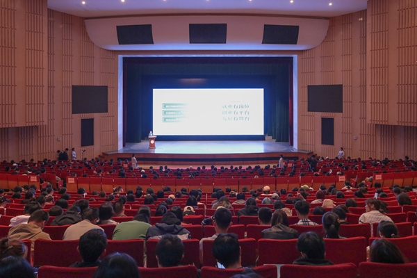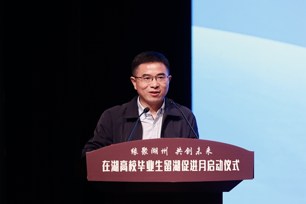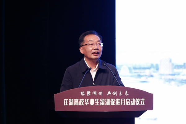 為深入實施人才強市創新強市首位戰略,做活人才“引育留用”文章,吸引更多在湖高校畢業生留湖就業創業,11月8日下午,“緣聚湖州·共創未來”在湖高校大學生留湖促進月開幕式在我校舉行。湖州市副市長夏堅定、我校黨委副書記丁敢真、湖州學院黨委副書記唐華、浙江水利水電學院副院長姜翰照、浙江工業大學(莫干山校區)管委會常務副主任肖春、湖州職業技術學院副校長李曉英等出席儀式。市縣區人社局負責人,浙江工業大學、浙江科技學院、浙江水利水電學院、湖州學院、湖州職院、浙江宇翔職院和我校相關職能部門負責人及二級學院班主任、就業輔導員代表,以及來自湖州學院、湖州職院及我校的學生共1200余人參加儀式。