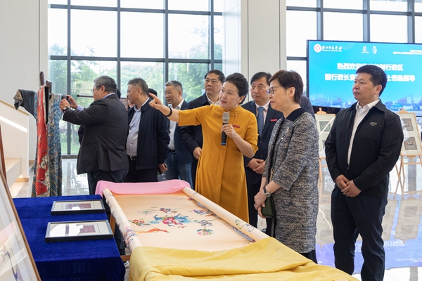 報告會前,林鄭月娥女士一行參觀了我校“古董刺繡”展、踐行“兩山”理念展示館。
