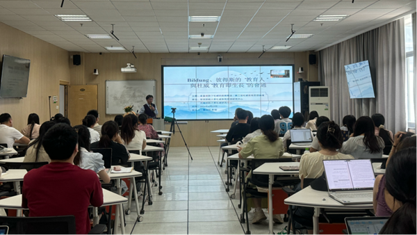 本次論壇邀請到了臺灣屏東大學大武山學者、臺灣教育哲學學會理事長、屏大教育行政研究所的簡成熙教授主講,他以“Bildung、彼得斯的‘教育人’與杜威‘教育即生長’的會通”為題,為線上線下百余名師生帶來了一場思想的盛宴。