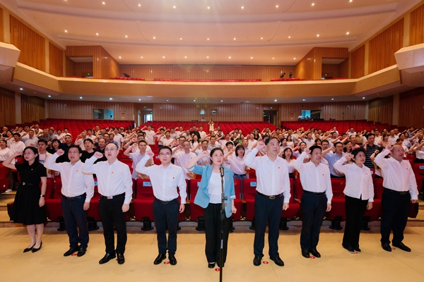 面向鮮紅的黨旗,校黨委書記許慧霞帶領(lǐng)師生黨員重溫入黨誓詞。