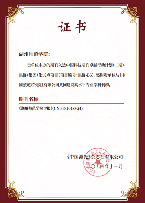 近日,“中國科技期刊卓越行動計劃二期項目”入選名單正式揭曉,《湖州師范學院學報》成功入選由《中國激光》雜志社牽頭申報的“中國科技期刊卓越行動計劃(二期)·集群(集團)化試點項目”(項目編號:集群-B5),標志著學報建設邁上了新臺階。