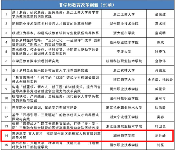 近日,浙江省教育廳發布公告,公示了2024年學習型社會建設重點任務(繼續教育領域)項目,我校項目“思進思變 育人育才 推進湖州地區退役軍人教育培訓高質量發展”非學歷教育改革創新項目入選。