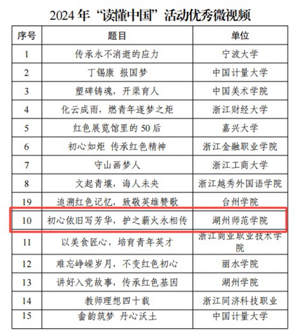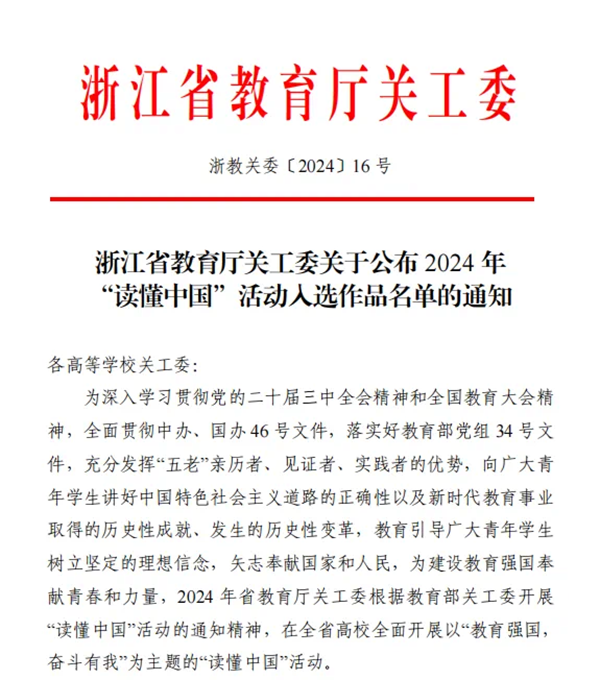 近日公布的《浙江省教育廳關工委關于公布2024年“讀懂中國”活動入選作品名單的通知》(浙教關委〔2024〕16號),我校關工委選送的由醫學院、護理學院劉晟、姜艷霞等學生制作的作品《初心依舊寫芳華,護之薪火永相傳——記第35屆南丁格爾獎章獲得者鄒瑞芳》獲省教育廳關工委2024年“讀懂中國”活動優秀微視頻獎,學校關工委獲省教育廳關工委2024年“讀懂中國”活動表揚單位。