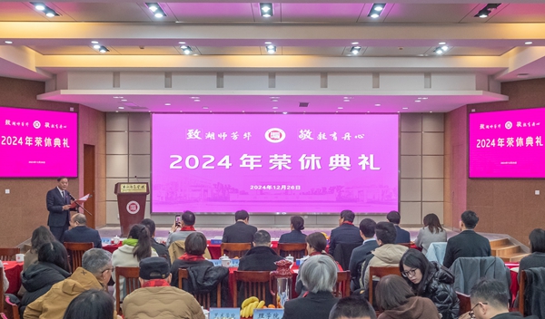 會場上,屏幕滾動播放著榮休教職工從教生涯的影像和對學校的祝愿。今年我校退休教職工共有40位,是學校成立以來退休教職工最多的一年。他們來自17個二級單位,平均工作年限超過36年,其中最長的達43年。他們踐行湖師精神,教書育人、無私奉獻,親歷并推動了學校事業發展,為學校“創大拼‘博’”作出了重要貢獻,是學校永遠的驕傲和寶貴的財富。