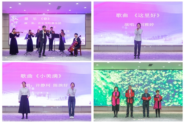 典禮在音樂學院器樂團師生輕快愉悅的節目《春》中拉開序幕。同學們還用《這里好》和《小美滿》表達了誠摯而美好的祝福,退休教職工聲情并茂的詩朗誦《老有老的驕傲》更是將會場的氛圍推到了高潮。