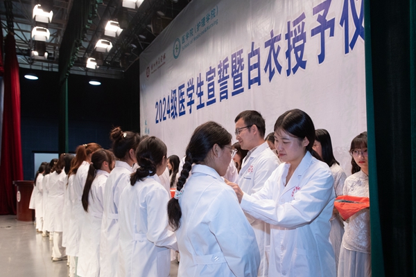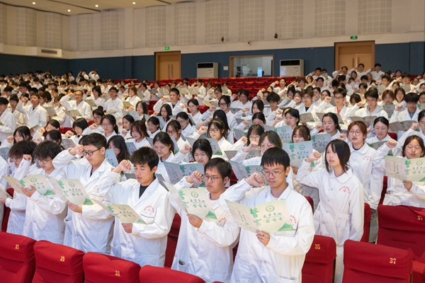 “健康所系,性命相托。當(dāng)我步入神圣醫(yī)學(xué)學(xué)府的時(shí)刻,謹(jǐn)莊嚴(yán)宣誓:我志愿獻(xiàn)身醫(yī)學(xué),熱愛祖國(guó),忠于人民……”445名2024級(jí)新生身穿白衣,在附屬第一醫(yī)院副院長(zhǎng)張穎的帶領(lǐng)下莊嚴(yán)宣誓。