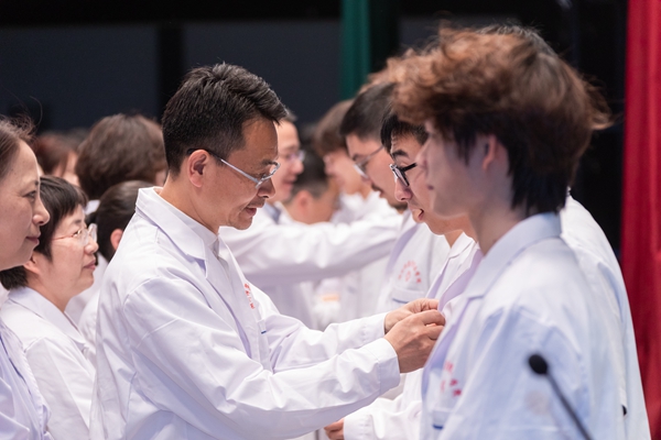 儀式最后,丁敢真代表學(xué)校向2024級(jí)全體醫(yī)學(xué)生表示親切的問候,向關(guān)心支持我校醫(yī)學(xué)教育事業(yè)發(fā)展的市衛(wèi)健委、相關(guān)醫(yī)療機(jī)構(gòu),以及醫(yī)學(xué)院的廣大校友們表示衷心的感謝,向?yàn)槲倚at(yī)學(xué)教育工作付出辛勤勞動(dòng)的老師們表示誠(chéng)摯的敬意。他對(duì)2024級(jí)醫(yī)學(xué)生提出了三點(diǎn)希望:賡續(xù)醫(yī)學(xué)血脈,有主動(dòng)擔(dān)當(dāng)?shù)淖鳛椋缓穹e醫(yī)學(xué)知識(shí),有不斷創(chuàng)新的勇氣;不畏艱難困苦,有堅(jiān)韌不拔的品質(zhì)。