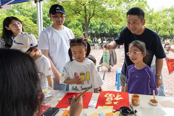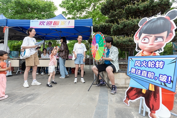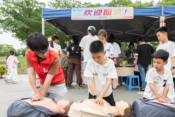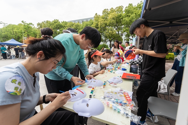 下午13:30,校友們在東校區校訓廣場報到,領取打卡地圖和活動定制紀念包,觀看舞龍舞獅表演,并在校友簽名墻上留下簽名和寄語,鐫刻難忘記憶。在吳興園,校友們轉動彩虹轉盤,并感受手工漆扇的樂趣。在大學生活動中心,學校準備了豐富的音樂節目,并為校友現場畫人像速寫。在恩澤碑,校友們在畫板上留下印記,共同作畫,參與投壺游戲,回憶昔日友誼。在講解員的帶領下參觀完校史博物館、沈行楹聯藝術館之后,校友們來到胡瑗廣場,參與拼貼詩會、折扇創作、“杏壇尋春”山野手作集市的“青綠扎染、植物拓染、花藝帽匠”等活動,在胡瑗像前合影留念,重溫繽紛校園時光。在德清湖,學校為校友們準備了專屬“軟陶記憶包”,內含校徽或院徽配色陶土及模具,可以現場制作并帶走留念。在月亮廣場,校友們一起為校園植物制作并掛上科普書簽,參觀校園“小花大世界”攝影活動優秀作品展,并聆聽學院科普講座?;顒咏K點設在東校區校友中心,校友們在此領取紀念獎章,珍藏美好回憶;參觀校園文創產品展覽,感受校園文化魅力。