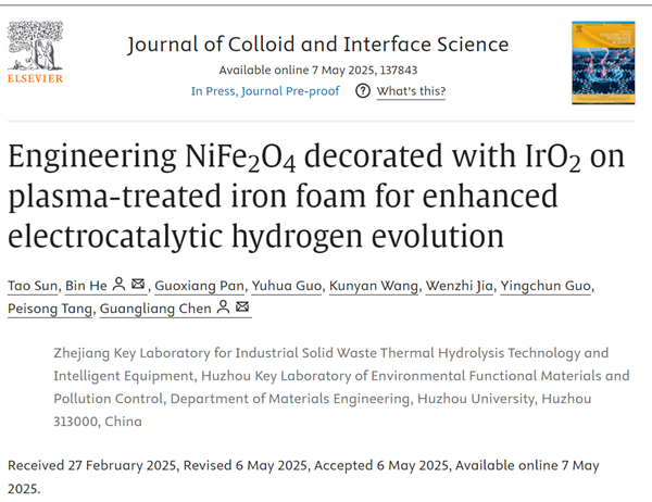 近日,我校工學院材料科學與工程系何斌副教授、陳光良教授以我校為第一單位在化學領域知名期刊《Journal of Colloid and Interface Science》(中科院一區TOP,IF:9.4)上,發表題為 “Engineering NiFe2O4 decorated with IrO2 on plasma-treated iron foam for enhanced electrocatalytic hydrogen evolution” 的研究文章。