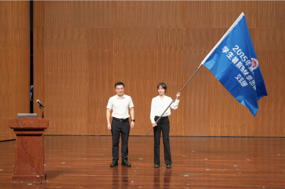丁敢真為學生代表授予“2025年暑假及秋季出國(境)交流團”旗幟。