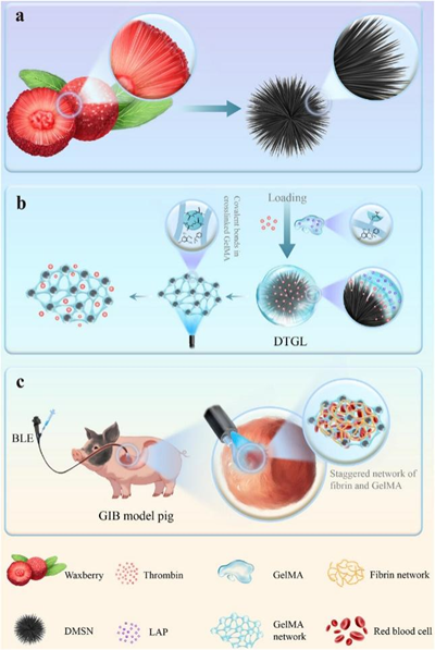 為此,我校和陸軍軍醫大學新橋醫院合作的研究團隊從楊梅果實獨特的微纖維結構中獲得啟發,成功開發了一種具有仿楊梅結構的納米二氧化硅載體,表面包覆甲基丙烯化明膠,通過藍光激光在內窺鏡下實現快速激活,形成穩定的智能納米凝膠網絡。這種新型納米凝膠僅需5秒即可在出血部位快速啟動凝血過程,即便對于凝血功能障礙患者也具有顯著療效。研究進一步證實,該納米凝膠所形成的血凝塊穩定性強,能夠有效抵御消化道內的嚴酷環境,防止繼發性出血。此外,注射后的凝血酶快速將纖維蛋白原轉化為纖維蛋白,構建了增強凝塊穩定性的雙網絡結構。實驗顯示,這一雙網絡系統在肝硬化患者的血液中表現出優異的粘附性能和止血效果,同時在小型豬食管、胃及十二指腸出血模型中也獲得顯著療效,具有廣泛的臨床應用前景。
