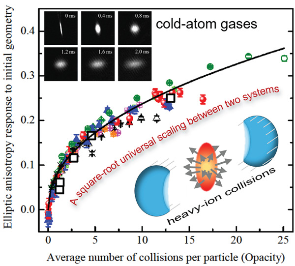 該研究發現了適用于冷原子氣體與夸克-膠子等離子體由于初始空間各向異性而產生的動量空間各向異性膨脹的普適標度律,及其類似于“隨機游走”的典型特征。該研究成果有效挑戰了描述相互作用系統膨脹機制的流體動力學范式,促進了該領域對各向異性膨脹機制的更深入理解。冷原子氣體與夸克-膠子等離子體這兩個體系在尺度、溫度和物理原理上都存在巨大區別,該研究在這兩個看似不相關的系統間搭建了橋梁。人們普遍認為夸克-膠子等離子體是宇宙的最初始狀態,但相關實驗研究存在不可避免的局限性;而基于常規實驗室條件的冷原子系統具有參數空間可以大范圍準確調節的優勢。因此,該研究成果檢驗了基于冷原子實驗系統研究夸克-膠子等離子體的優越性,進而有可能推進對早期宇宙的進一步研究。