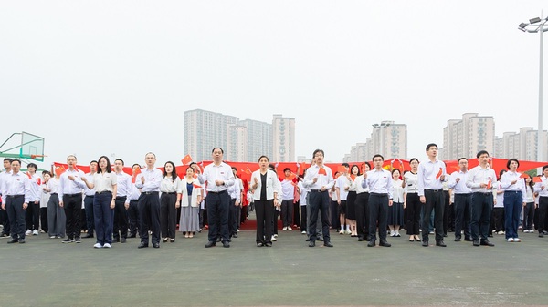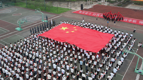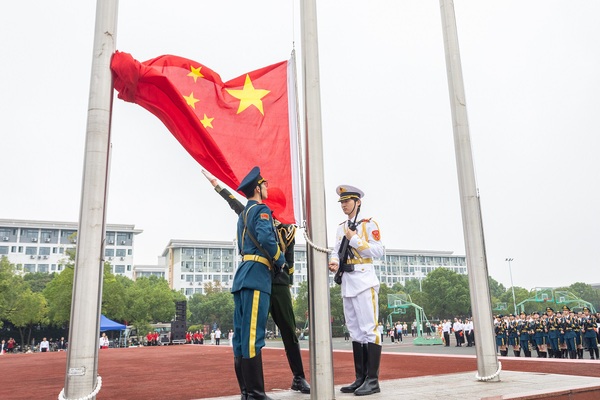 國旗護衛隊英姿颯爽,邁著鏗鏘有力、整齊劃一的步伐護衛國旗入場。在莊嚴的國歌聲中,五星紅旗冉冉升起,迎風飄揚。全體師生肅穆而立,齊聲高唱國歌,向國旗行注目禮。