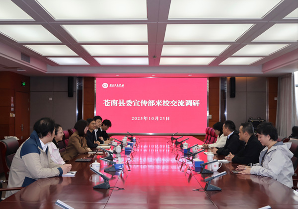為持續深化合作、優化文化特派員工作機制,10月23日,蒼南縣委宣傳部常務副部長陳國子,蒼南縣委宣傳部副部長、縣社科聯主席金招輝一行專程回訪我校,就省級文化特派員李睿浦老師的工作情況及校地合作深化議題與校方進行座談。校黨委委員、宣傳部長朱小芳,音樂學院黨總支書記何小勤,音樂學院副院長(主持行政工作)魯立等參加座談。