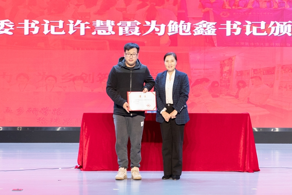 許慧霞為安吉縣孝豐鎮(zhèn)夏陽村黨支部書記、村委會主任鮑鑫頒發(fā)湖州師范學(xué)院大學(xué)生創(chuàng)新創(chuàng)業(yè)導(dǎo)師聘書。