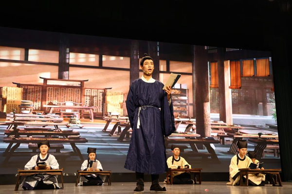 話劇《胡瑗》全劇分為三幕,以說書人的念白引出胡瑗先生一生的幾個重要階段,生動呈現(xiàn)了胡瑗先生的求學(xué)、教書與育人經(jīng)歷。該劇不僅藝術(shù)化地闡釋了胡瑗先生所倡導(dǎo)的“明體達(dá)用”教育思想及其創(chuàng)立的“分齋教學(xué)”教育制度,更充分彰顯了他堅韌不拔的治學(xué)精神與前瞻開放的教育理念。今年,《胡瑗》在去年劇本的基礎(chǔ)上進(jìn)一步創(chuàng)新,著重改進(jìn)了說書人的臺詞表達(dá),使其更貼近青年的語言習(xí)慣與觀察視角,力求打造一部更能引起當(dāng)代大學(xué)生共鳴的話劇作品。