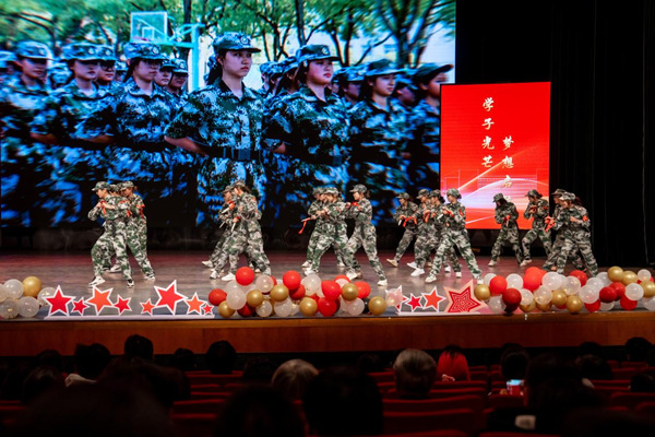 輔導員與學生代表帶來了青春勵志歌曲串燒;退役大學生士兵代表、軍訓學生教官沈斌曉帶領新生女兵,帶來了入列儀式和匕首操表演。