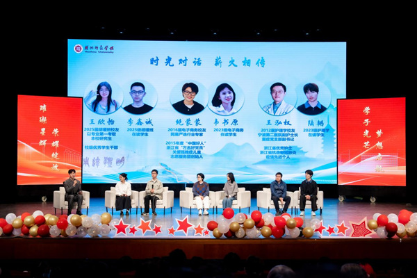 現場,優秀本科生代表陳雨悅、研究生代表林森豪分享了他們的追光心路;生命科學學院20230911班帶來班級風采展示,展現了同窗之誼、集體之魂。優秀校友代表、2025屆小學教育(胡瑗班)畢業生王欣怡,網易嚴選貿易有限公司鮑蒙蒙,寧波市第二醫院重癥醫學科副護士長、重癥黨支部副書記王泓權,與在校生代表李鑫誠、韋書原、陸韜,在傳承與對話中接力師院精神。