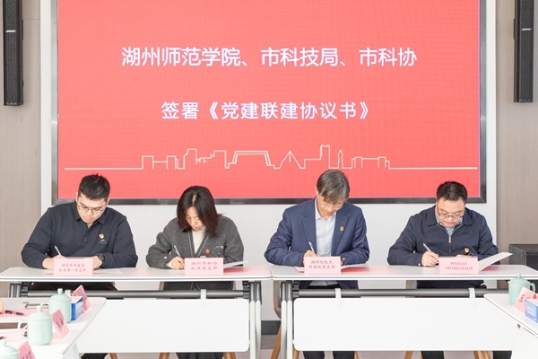 儀式上,我校機關科技處黨支部、機關社會合作與發展聯絡辦公室教育發展基金會聯合黨支部與湖州市科技局機關第一黨支部、湖州市科協機關黨支部共同簽署《黨建聯建合作協議書》,標志著四方黨建聯建合作全面啟動。李慶峰、夏陽、汪方華共同為湖州市首家高校“科學咖啡館”揭牌。