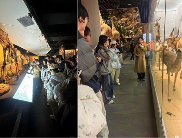 抵達博物館后,在老師的引導下,同學們帶著課程中的疑問與思考,依次走進恐龍館、海洋館、貝林館與生態館,開啟了一場“識生物、守多樣、悟共生”的探索之旅。在恐龍館內,逼真的恐龍骨架與復原場景,讓同學們直觀感受史前生態系統的演變,了解生物多樣性與環境變遷的緊密關聯。海洋館與貝林館則成為“守護生物多樣性”的生動課堂。海洋館中,豐富的海洋生物標本、沉浸式的海洋生態模擬場景,展現了海洋生態的瑰麗與脆弱,讓大家認識到海洋保護對全球生態平衡的重要意義。貝林館內,來自全球珍稀動物標本錯落陳列,講解員結合標本背后的故事,闡述生物多樣性保護的全球共識,以及我國在生態保護領域的責任與擔當。