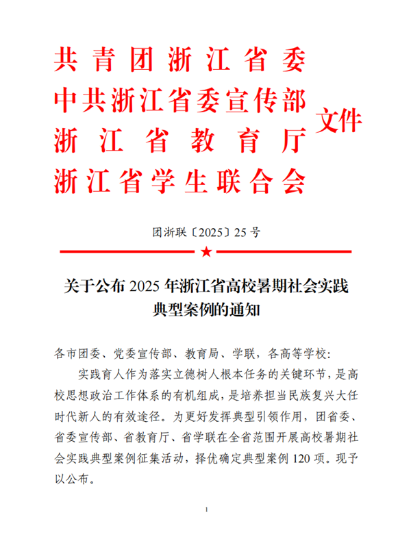 近日,團省委、省委宣傳部、省教育廳、省學聯公布了2025年浙江省高校暑期社會實踐典型案例評選結果,校團委2項調研報告獲評“美麗中國”“中國之治”典型案例。
